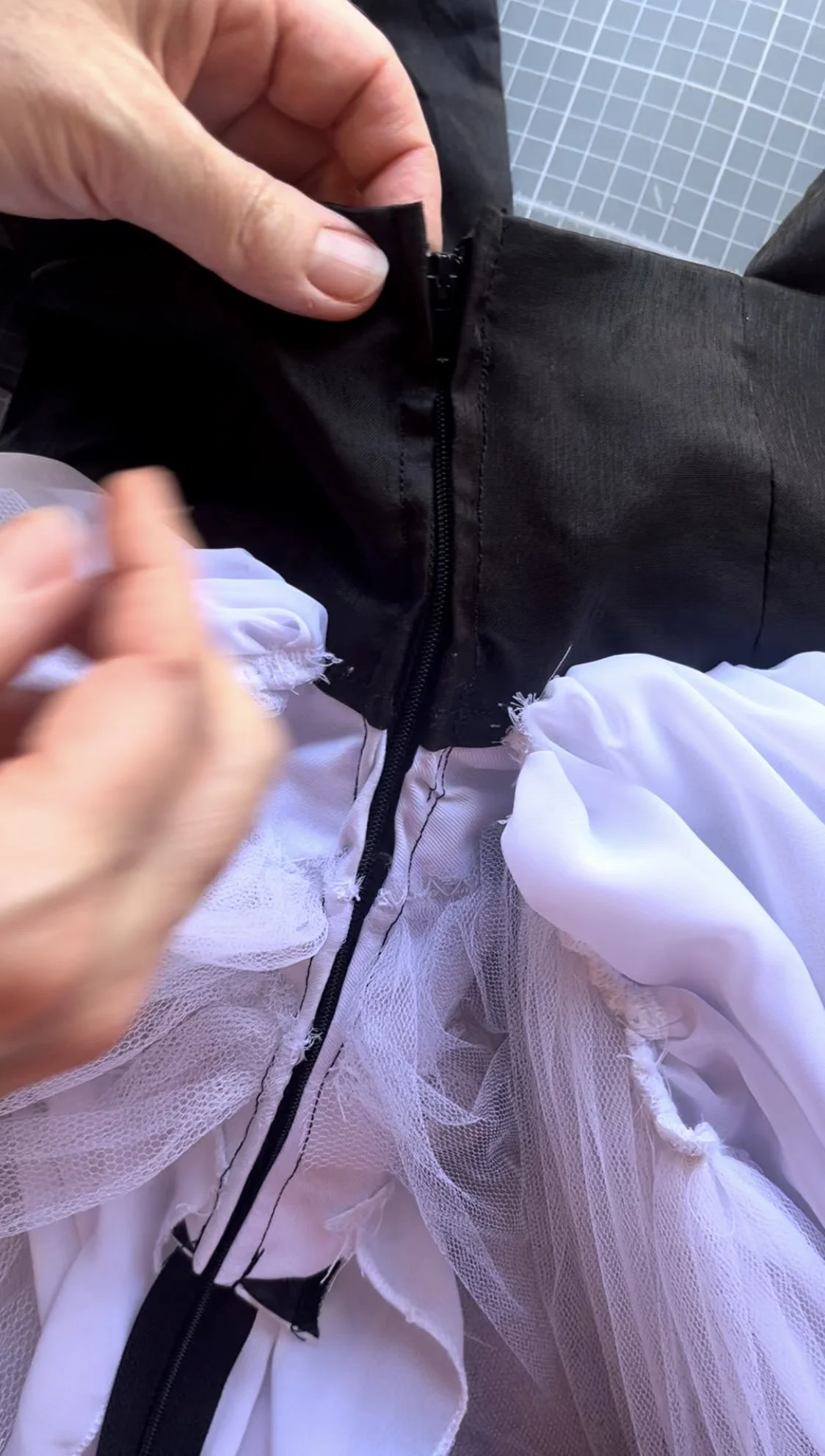 To achieve an ombre effect on the skirt, the net needed to be carefully dyed using spray-on fabric dye.