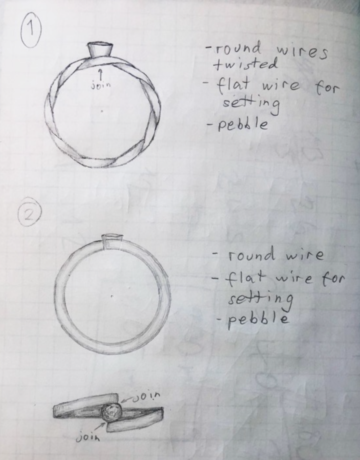Planning initial designs through sketch and experimenting with shape using uncooked pasta, which makes for a great substitute for malleable metals.